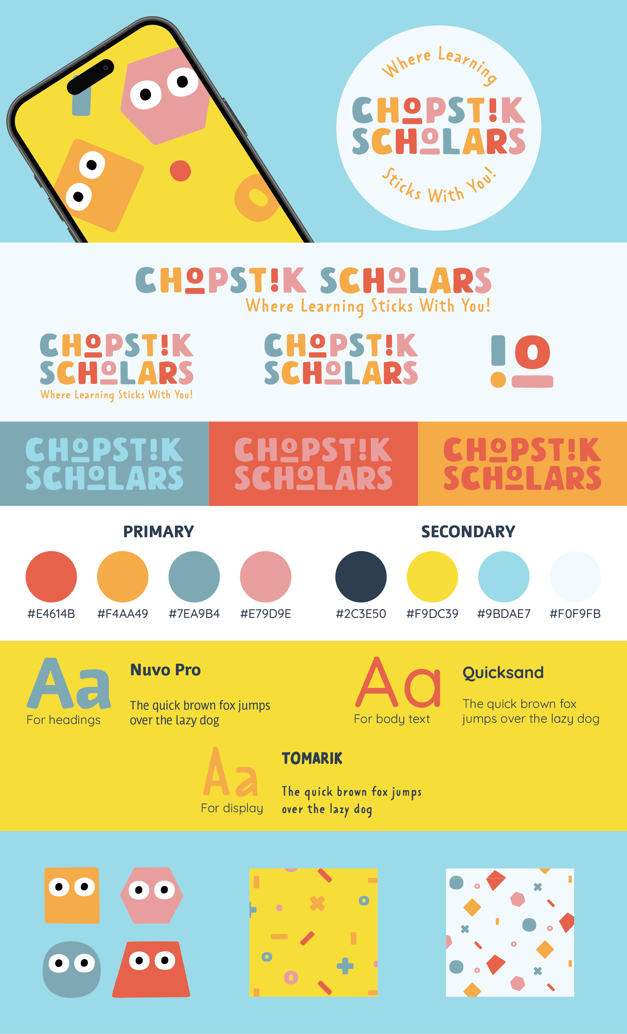 Chopstik Scholars is an edtech startup creating STEAM-based apps for preschool and elementary-aged children, with a focus on homeschooling families. As a new player in the education space, Chopstik Scholars sought a distinctive logo and cohesive branding system that would reflect their playful, forward-thinking mission while appealing to both young learners and their parents.