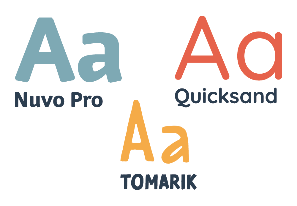 The typography system blends Nuvo Pro, Quicksand, and Tomarik