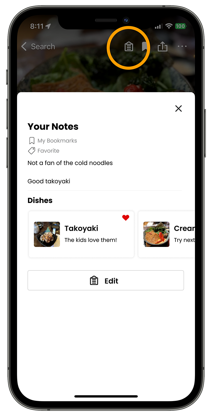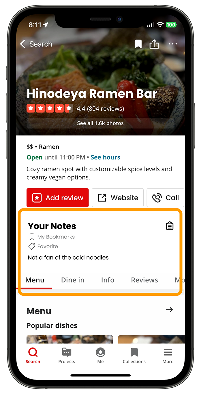 I rarely use bookmarks, but I would love to record specific info about dishes I'd like to eat or dishes I've eaten. If I could write personal notes and share them with friends, it would make me want to come back to the app more.