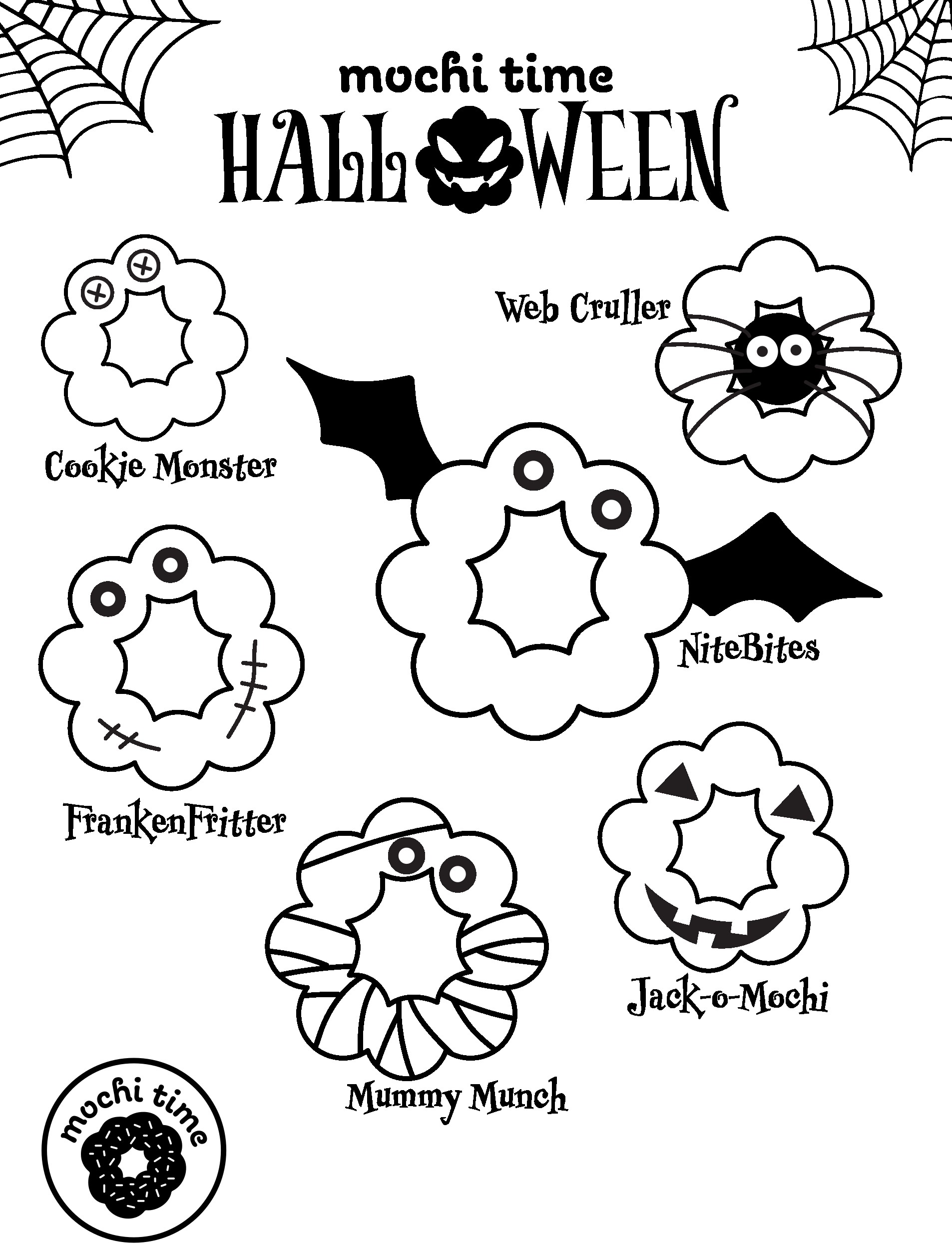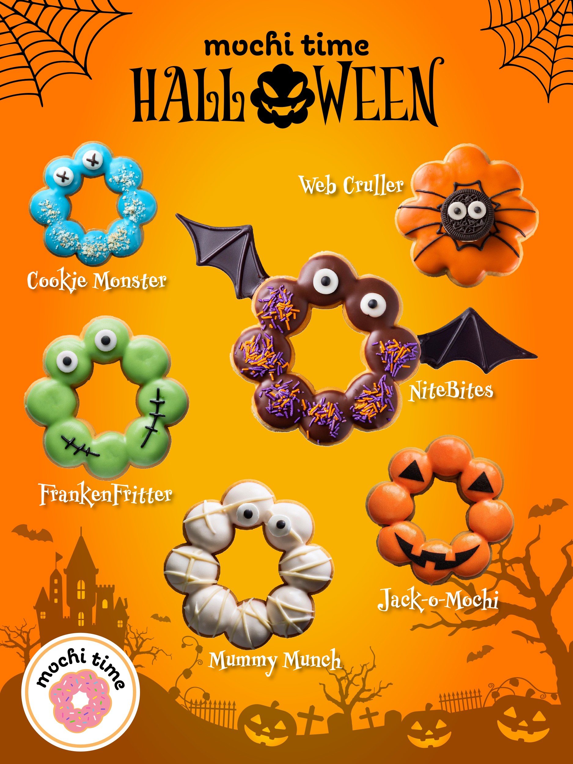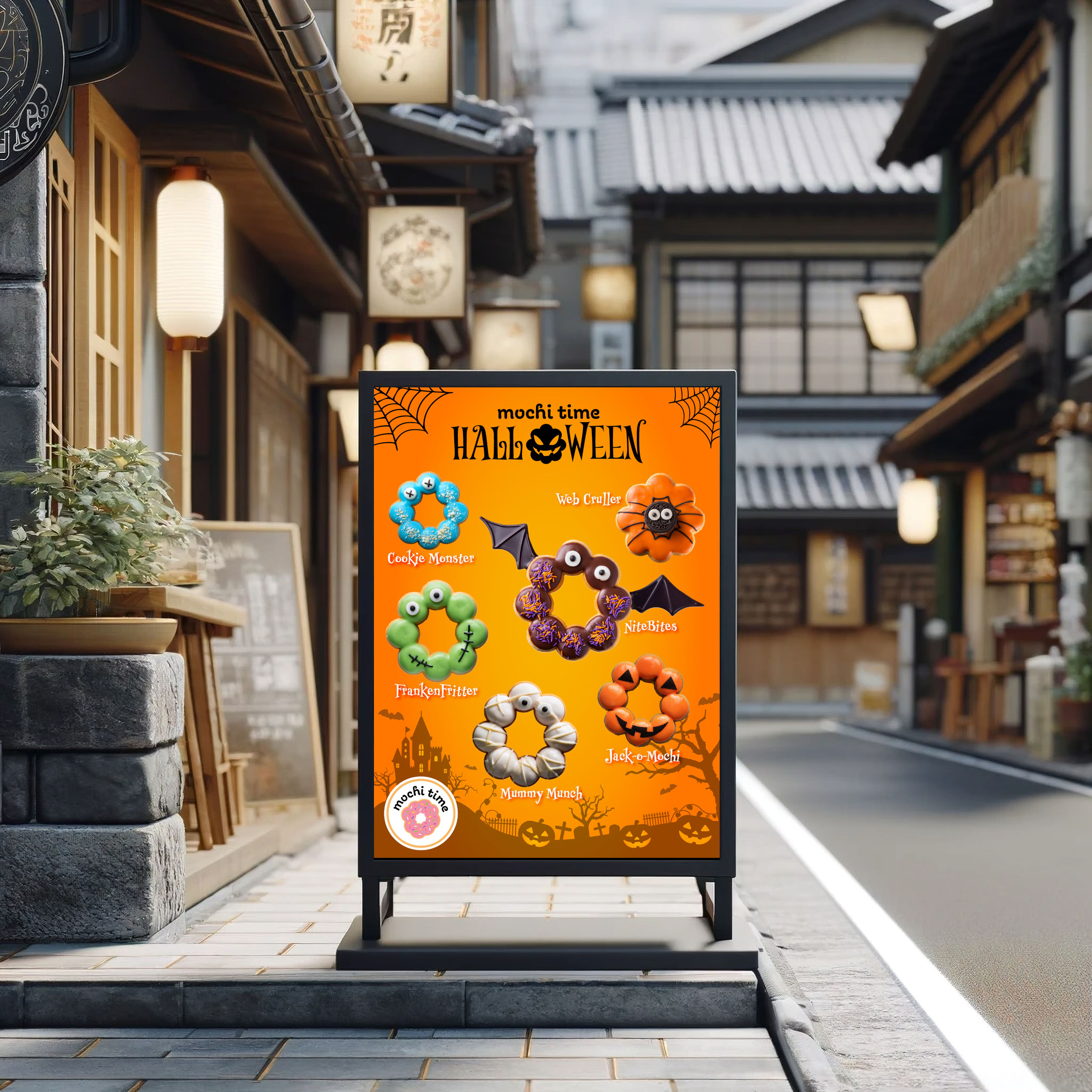 The project began with the creation of six Halloween-themed mochi donut concepts for Mochi Time. Each design was imagined as a playful character with a seasonal twist and a pun-based name that combined Halloween elements with the shape and charm of mochi donuts. These conceptual ideas served as the creative foundation for the visual exploration that followed.