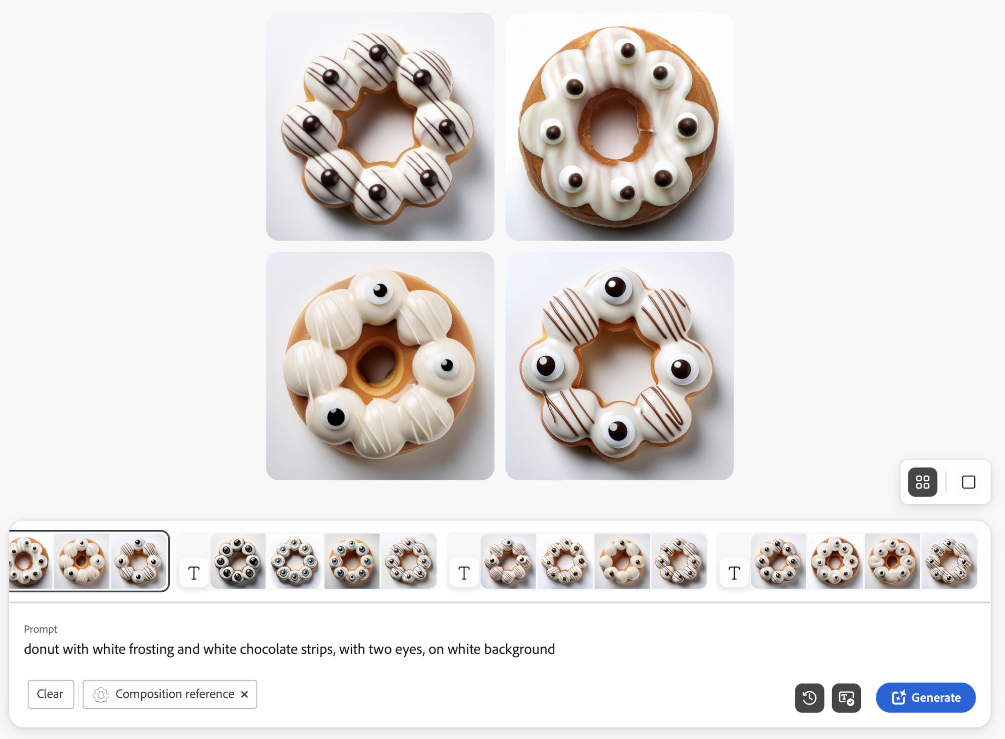 To improve accuracy, I created detailed black and white vector graphics in Illustrator to guide Adobe Firefly’s image generation. Paired with focused prompts such as "Donut with light blue frosting, two white eyes with X as pupil, dusted with cookie crumbs," these references produced more consistent results. I iterated on frosting colors, eye shapes, and toppings until each donut matched the intended look and personality.