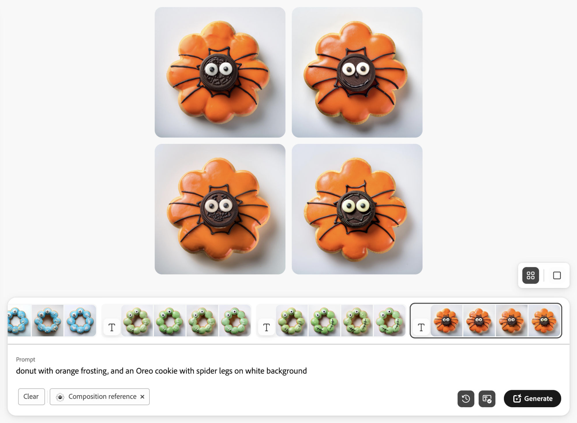 To provide more visual context, I created a simple black and white outline of a mochi donut to use as a composition reference image in Adobe Firefly. While this helped with basic shape recognition, the AI frequently misinterpreted the design by placing candy eyes or spiders on each individual mochi ball and introducing random elements outside the donut.