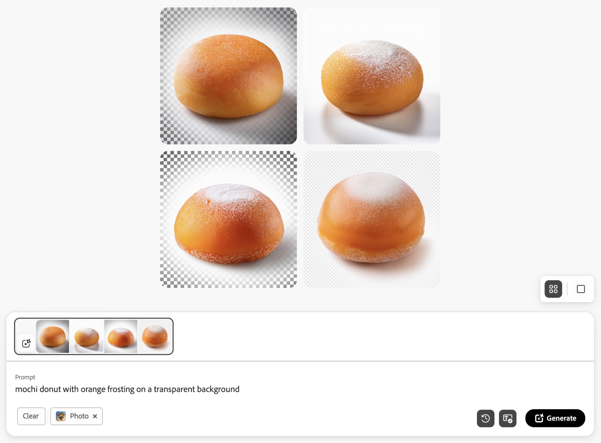 I began by experimenting with the text-to-image functionality in Adobe Firefly using only text prompts, without any reference images. I quickly discovered that the tool did not recognize the phrase "mochi donut," often rendering regular donuts without the distinctive ring shape made from connected mochi balls. This revealed the limitations of relying solely on text.